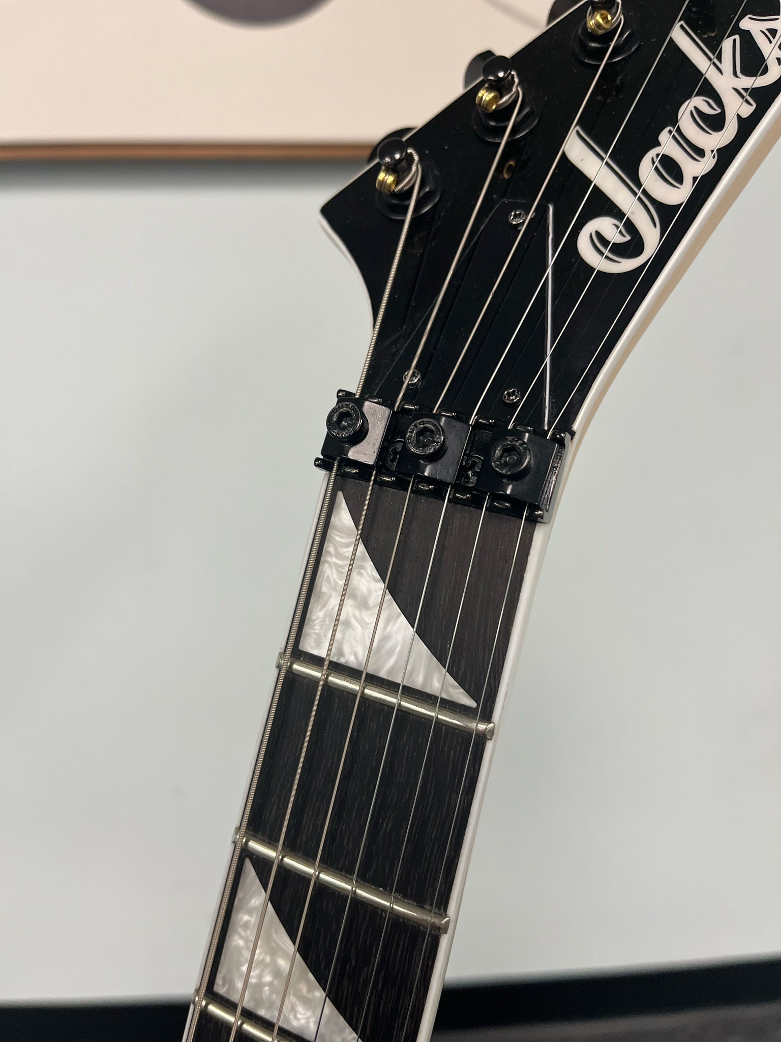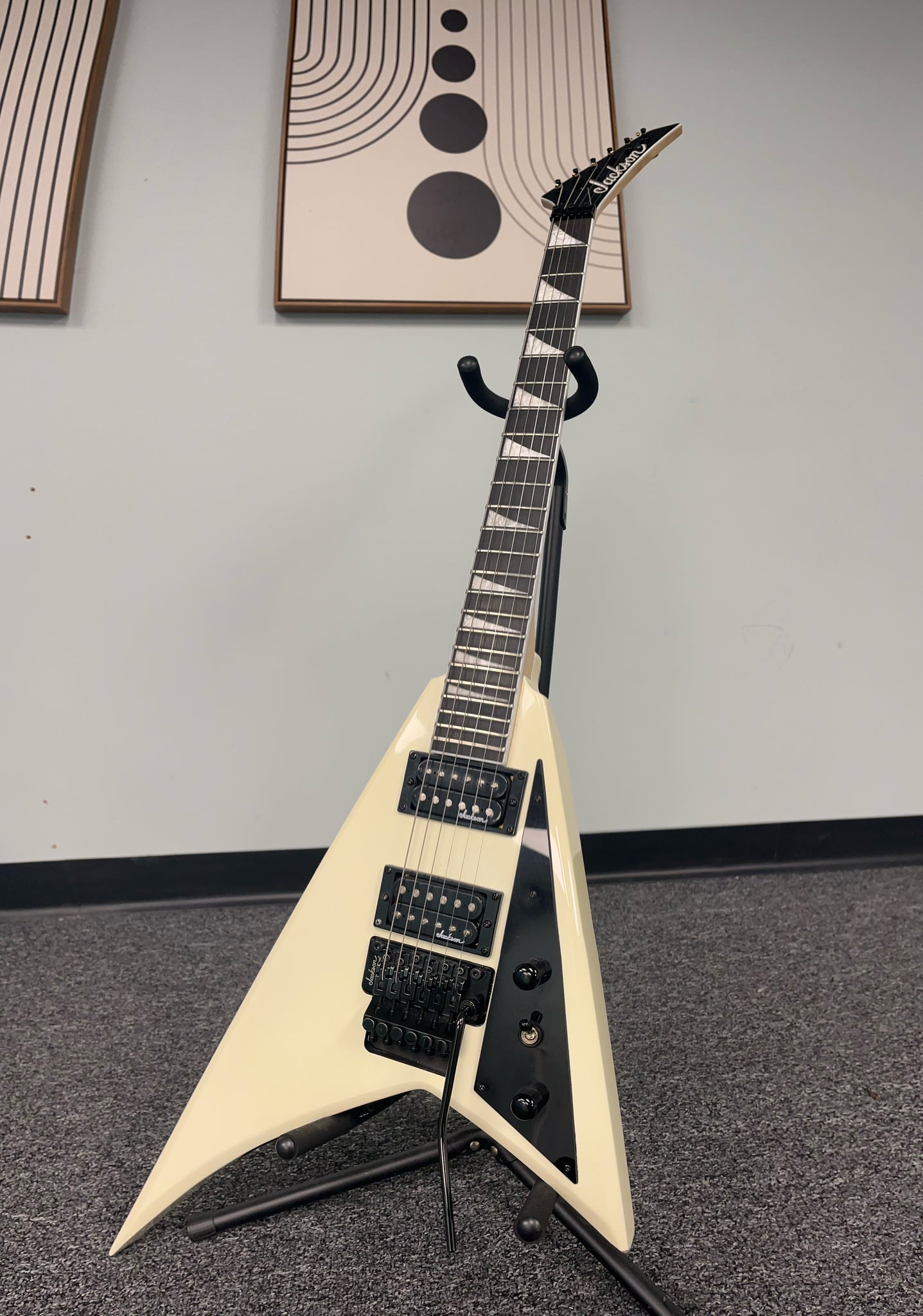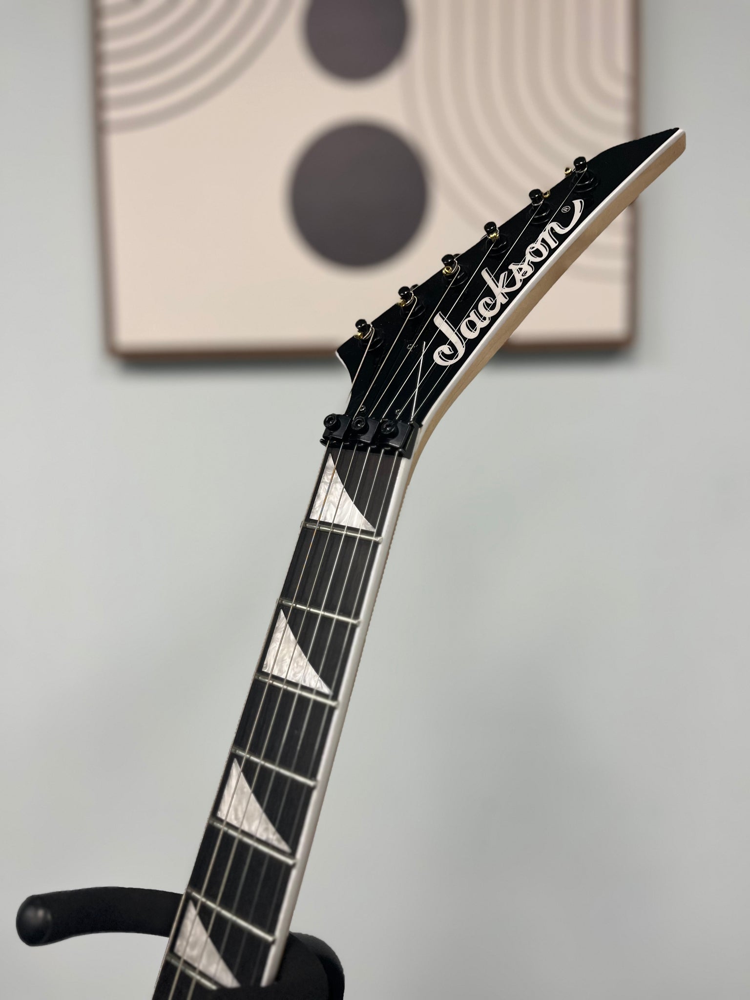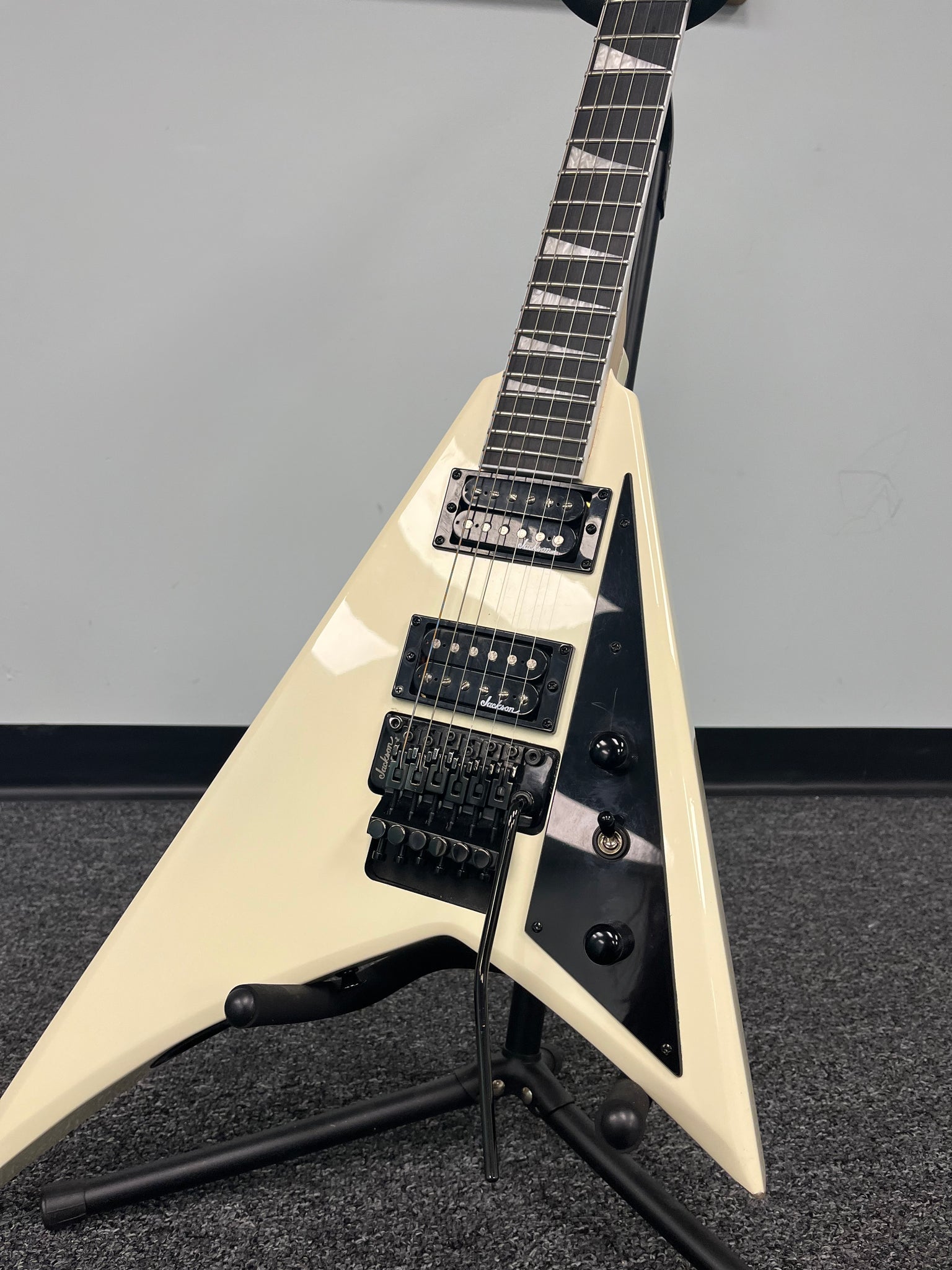 Other features include dual Jackson high-output humbucking pickups with ceramic magnets, single volume and tone controls, three-way toggle switch, a Jackson-branded Floyd Rose® double-locking tremolo bridge and sealed die-cast tuners.